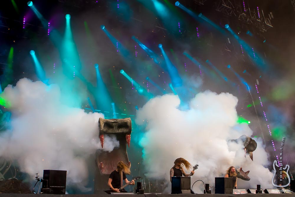Zwei große Drachenköpfe stehen auf der Bühne, einer ist begehbar und zu Beginn der Show speien sie Nebel, was das Zeug hält. „Amon Amarth“ hatte ich ja schon → 2012 in Wacken fotografiert und damals war das Bühnenbild ohne große Dekoration ausgekommen. Zur sehr fotogenen Performance der Musiker um Frontmann Johan Hegg kommen geniale Lichteffekte sowie immer wieder „irgendetwas mit Feuer“ (passend zu den Drachenköpfen). So ergeben sich fantastische Fotomotive – man muss halt nur im richtigen Moment das Tele fallen lassen und zum Weitwinkel greifen. Mehrmals höre ich die Kollegen neben mir fluchen und schimpfen, dass eigentlich ein Blinklicht als Hinweis mit Vorwarnzeit Pflicht sein müsste.