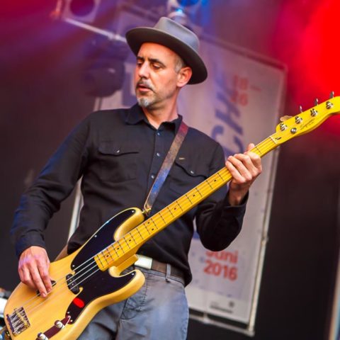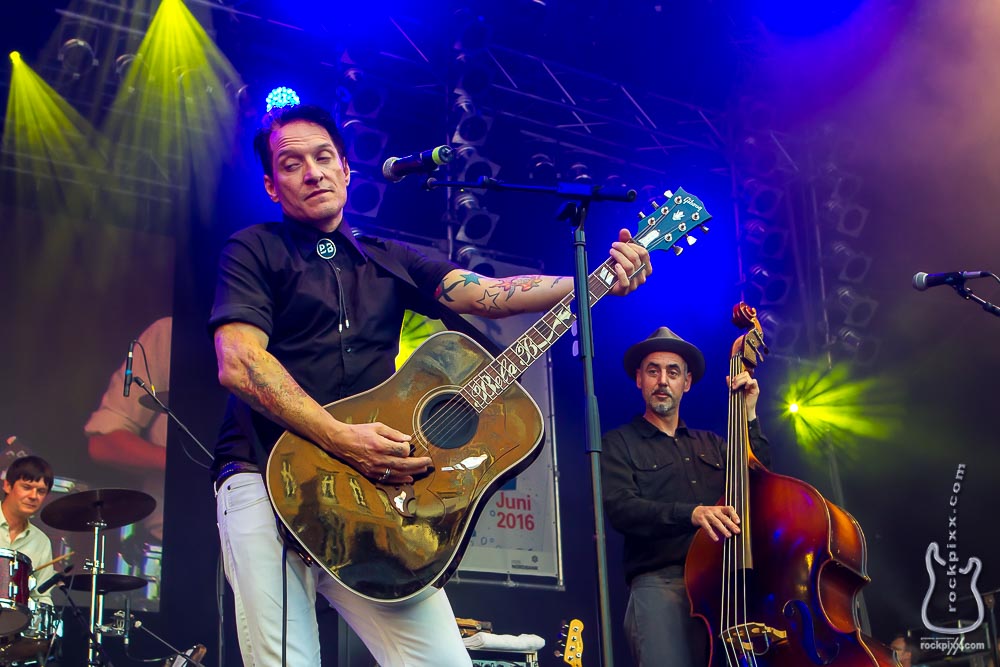 Und auch hier zeigt sich, dass wieder ein ganz anderer Musikstil zum Tragen kommt, als bei dem bekannten Trio, in dem er zusammen mit Farin Urlaub und Rodrigo González spielt. Somit steht vor mir eine gut aufgelegte Band aus Bela B und fünf weiteren Musikern, die allesamt ihrem charismatischen Frontmann zuarbeiten, ohne dass dieser sich explizit in den Vordergrund drängen würde. Optisch ist Bela B natürlich ein Spektakel mit seinem pailettenbestickten Jackett und der Superstar-Sonnenbrille. Dazu passen auch die Gürtelschnalle sowie der Halsschmuck mit seinen Initialen und die Inlays im Gitarrenhals – nicht zu vergessen seine Ringe. Musikalisch perlt dem Publikum auf dem mehr als gut gefüllten Rathausplatz eine Mischung aus Country und Hillbilly mit deutschen Texten ins Ohr plus entsprechender Ansagen des Frontmannes.