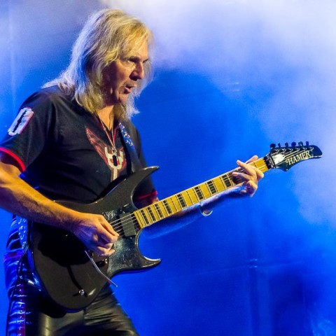 Judas Priest als die Urväter des Heavy Metal stehen schon seit 1969 auf der Bühne – ich glaube, da war ich noch nicht mal in Planung. Aber wer jetzt Opis mit Rollatoren auf der Bühne erwartet, der irrt. Es gab natürlich einige Besetzungswechsel, so dass wir als erstes einen richtig knackigen „Derwisch“ an der Gitarre zu sehen bekommen. Okay gerade eben ist die Frau in mir durchgegangen. Was zu Anfang gute und dynamische Bilder einbrachte, gestaltete sich dahingehend schnell zum Frust. Ich hatte nach 1 ½ Songs fast nur Bilder von Gitarrist Richie Faulkner. Sänger Rob Halford stand die ganze Zeit beim Drumset oder bewegte sich im hinteren Teil der Bühne, was bei der deutlich über zwei Meter hohen „True Metal Stage“ heißt, keine Bilder bzw. nur halbe Körper auf den Bildern. Blieb also nur auf die restlichen 1 ½ Songs zu hoffen. Die Geduld wurde belohnt und ich bekam noch Bilder von allen Bandmitgliedern zusammen.