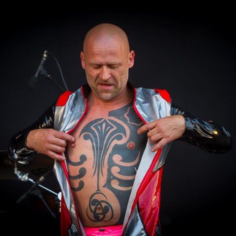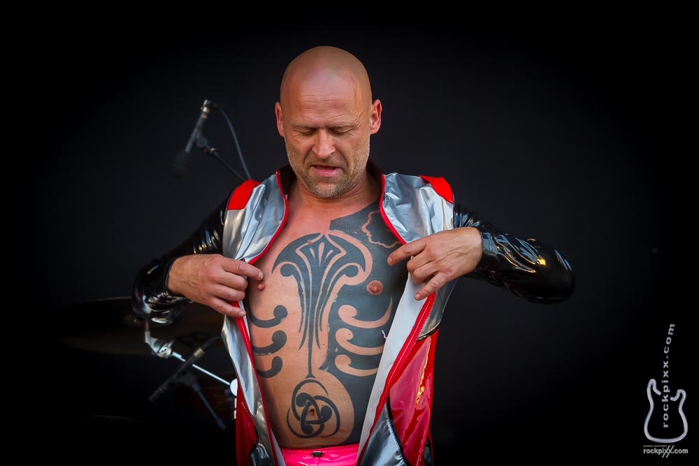 Die Requisiten auf der Bühne – gerade an den Keyboards von Alf Ator – sprechen für sich und Frontmann „Stumpen“ lässt sich noch während des Beginns vom freundlichen Gitarristen nebenan aus dem Lackanzug helfen und befördert diesen mit weitem Schwung ins Publikum – dankbare Abnehmer sind garantiert, er hätte auch hunderte von Lackanzügen werfen können. Nun steht er also im knallpinken Latexhöschen vor uns und lässt uns an der Pracht seiner Tattoos teilhaben. „Steht“ ist vielleicht nicht ganz korrekt formuliert, das ist nämlich das Einzige, was er nicht macht. Vielmehr hüpft, rennt, fliegt er über die Bühne, in den Graben, zu den Zuschauern, krabbelt wieder über die Boxen zurück auf die Bühne, … keine Millisekunde Stillstand lautet die Devise. Dabei singt, schreit, flüstert er – teilweise ohne Luft zu holen, so scheint es.