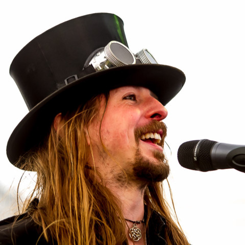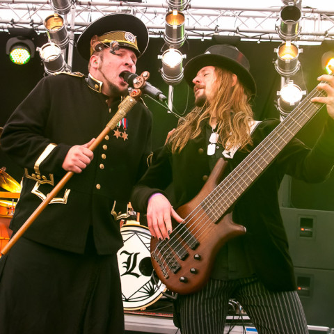 Ich war schon etwas früher im Zelt, da das ganze Line-Up mit den Zeiten und der Auftrittsreihenfolge an diesem Tage vollkommen durcheinander geraten war. Dies bescherte mir einen der ungewöhnlichsten Soundchecks, die ich bisher erlebt habe. Als die Mikros eingestellt wurden, gab der Sänger mit kraftvoller Stimme „Auf der Mauer auf der Lauer sitzt ne kleine Wanze“ und der Bassist schmetterte im Karel Gott-Stil „Biene Maja“ ins Mikro. Das anwesende Publikum hatte seinen Spaß dabei. Also singen können die Musiker von „La Frontera Victoriana“ – spielen übrigens auch. Ihren früheren musikalischen Hintergrund der etwas härteren Art können und wollen sie auch heute nicht verleugnen. Und so spielen sie ein sehr sauberes rockiges Programm mit Fokus auf deutsche Texte, welches sie mit netten Showeinlagen und sehr viel Spielfreude anreichern. Die Bühnenkostüme und auch die Deko bzw. die Requisiten erfreuten natürlich das Auge der Fotografin: Steampunk, mit viel Liebe zum Detail.
