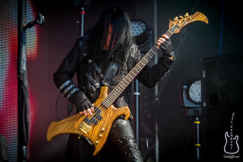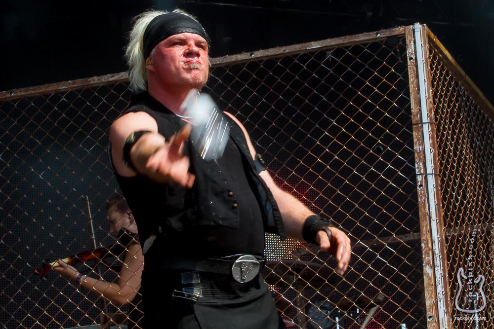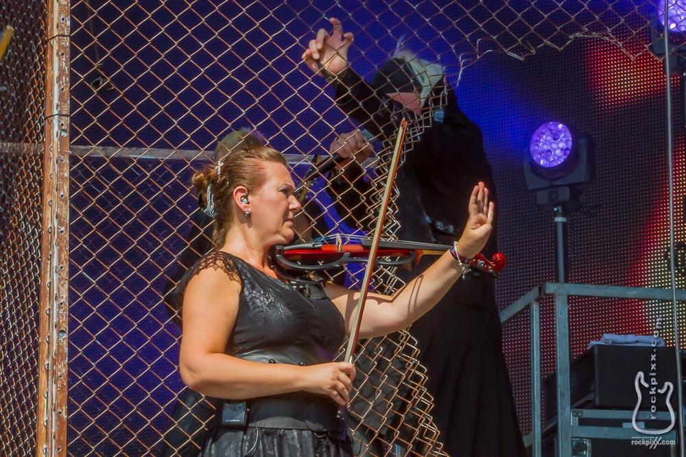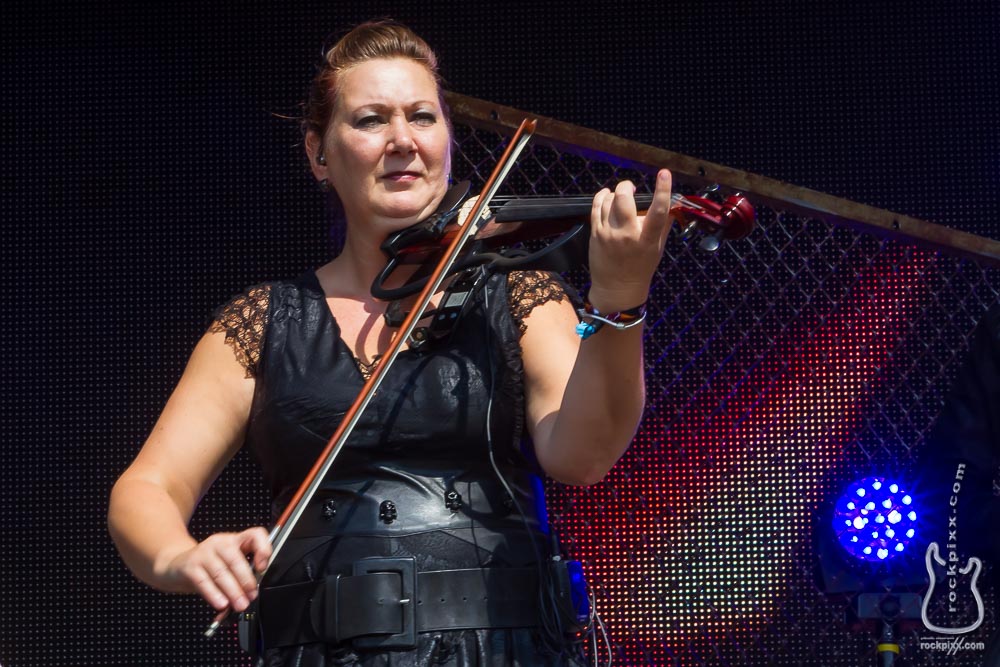 Vom Stil her würde ich sie als deutlich härter einstufen als es am Abend zuvor noch „Faun“ gewesen waren, auch das Bühnenbild kommt eher rustikal als lieblich daher. Bewundernswert finde ich, dass die Musiker trotz der mittlerweile mörderischen Hitze, die auf dem Gelände herrscht, ihre schweißtreibende Performance trotzdem in den dunklen schweren Kostüme durchziehen.