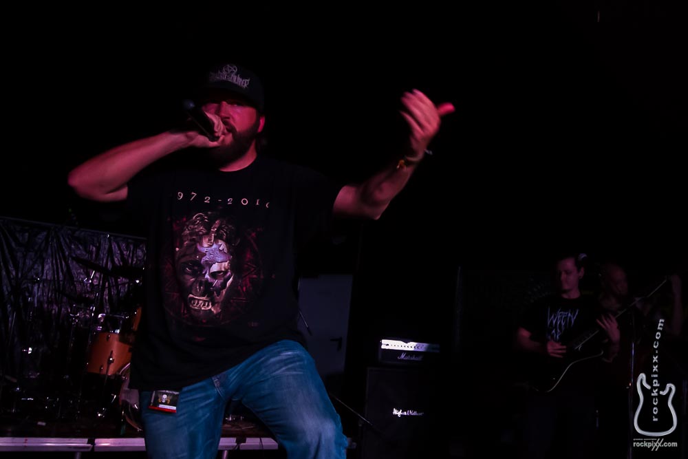 Aus Lübeck kommen also nicht nur weiche Dinge wie Marzipan, sondern auch knallharter Metal, der jetzt aus den Boxen wummert. „The Riddle of Sicken“ wurde 2000 in der Stadt des Holstentors gegründet und erst jetzt erlebe ich diese Band zum ersten Mal. Und ich muss feststellen, das reißt das Publikum an diesem Abend zum ersten Mal richtig mit und auch nach vorne an die Bühne. Der leere Platz vor der Bühne (das berühmt-berüchtigte „Norddeutsche Hufeisen“) ist plötzlich mit Zuschauern gefüllt, die begeistert mitgehen. Zu verdanken ist das allerdings auch dem unermüdlichen Einsatz von Frontmann „Dude“, der alles gibt, damit das Publikum endlich einmal auftaut. Leider ist der Gig auch schon wieder sehr schnell vorbei, um die Running Order dieser Nacht nicht aus dem Ruder laufen zu lassen. Aber während dieses kurzen Gigs hat sich gezeigt, dass Musik sehr wohl Menschen mobilisieren kann. Dafür gebührt „The Riddle of Sicken“ ein kräftiger Dank.